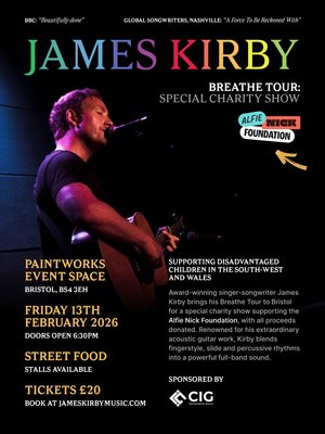 Award-winning singer-songwriter James Kirby brings his Breathe Tour to Bristol for a special Charity Show supporting the Alfie Nick Foundation, with all proceeds donated.